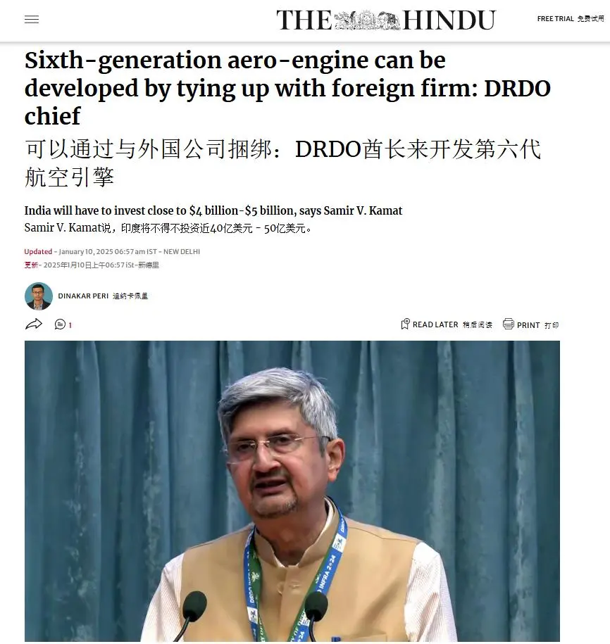 今年1月7日,卡馬特在出席一場技術研討會時明確表示,希望莫迪政府能將印度的軍工研發佔國防預算的比例從目前的5%提高到10%至15%,還説嘚逗的首要任務就是為印度國產戰機研製先進的配套發動機。印度未來至少需要投入40至50億美元,用於開發第六代航空發動機。“想要變強必須充錢,印度不應該再重蹈過去的錯誤了。”