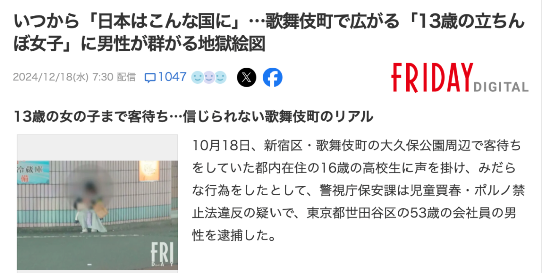 自疫情後,到東京大久保公園尋歡作樂的男人氾濫成災。儘管日本警方和相關部門持續加大打擊力度,然而還是無法制止,反而讓這些男人發掘層出不窮的招嫖方式,最終導致失足女孩愈來愈多,甚至出現低幼化趨勢。