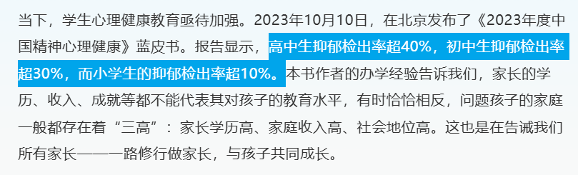 《2023年中國精神心理健康》藍皮書指出,高中生抑鬱檢出率超40%,初中生抑鬱檢出率超30%,而小學生的抑鬱檢出率超10%。