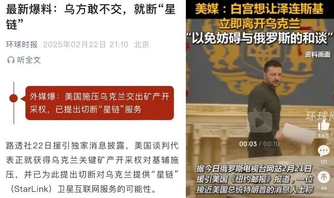 前天傳來兩個消息,一個是路透社稱美國談判代表説如果烏克蘭不把礦產開採權給美國,美國就切斷烏克蘭的“星鏈”服務(馬斯克之後説是假的)