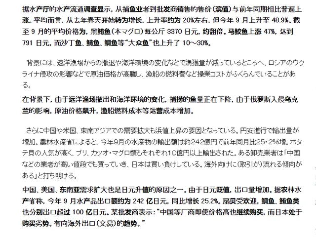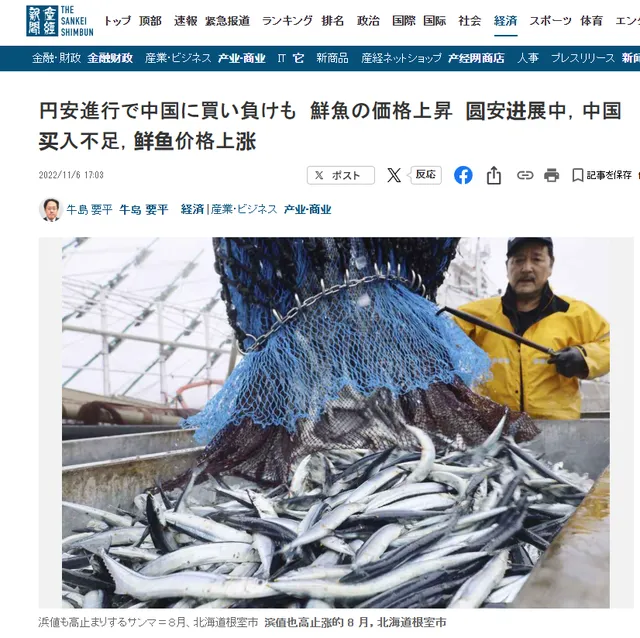 2022年11月,日媒《產經》在官網上刊載了一篇題為《因為日元貶值,再加上買又買不過中國,導致(日本)鮮魚價格持續上漲》的文章,其中有段話是這麼説的:“中美和東南亞各國對於日本海鮮的需求持續擴大。由於日元不斷貶值,出口量得以增加。據農林水產省介紹,截至2022年 9 月,日本水產出口額約為 242 億日元,同比增長 25.2%,其中日本扇貝尤其受歡迎,鯛魚和鮪魚的出口值也超過100 億日元。某批發商表示:來自中國的甲方出手最為闊綽,即使價格居高不下也要繼續購買,而日本買家則因為日元貶值和財力有限的原因處於劣勢。長此以往,日本的海鮮消費有從國內市場占主導地位逐步轉向倚重海外出口的趨勢。”