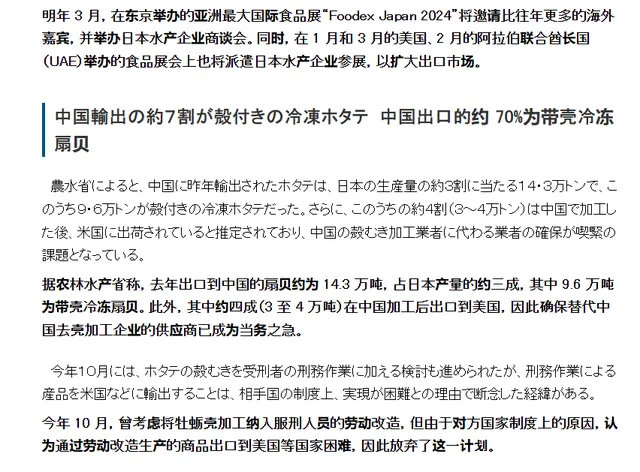 而當時間來到2023年8月,由於日本政府罔顧國際觀瞻、執意擅排福島核污水的可恥行徑激起了周邊國家的強烈不滿,中國政府決定叫停一切日本海鮮進口。一時間,失去中國這個最大客户給日本水產業造成的打擊極大,包括扇貝在內,這些日本漁民自己捕撈上來的海鮮都因為賣不出去而只能低價流轉國內市場。