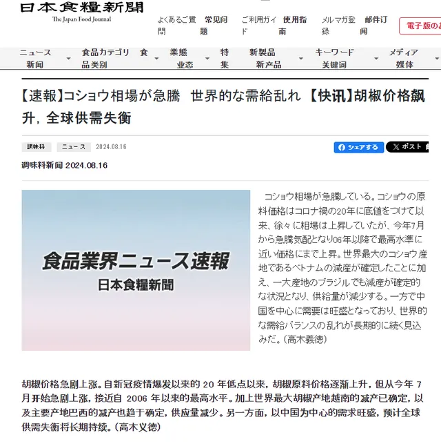 2024年8月,日媒“日本糧食新聞網”上刊登了一篇關注國際胡椒價格飆升的報道,並把相關問題的癥結歸納為兩個原因:一是新冠疫情給越南和巴西等國際主要胡椒出口國造成了不小的衝擊;二就是中國的需求過於旺盛,中國人買走了太多胡椒,從而導致國際市場貨源緊缺。