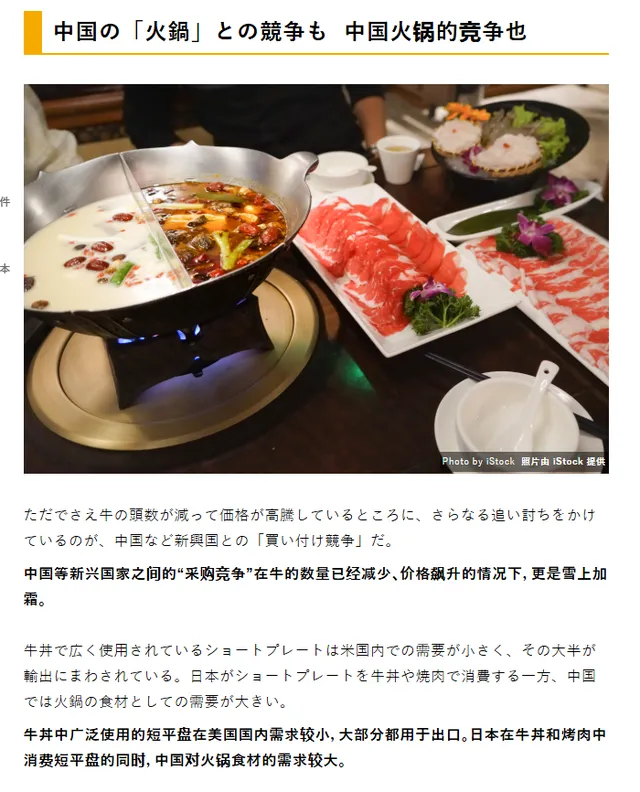 2024年7月,日媒《現代商業》刊登了一位名叫市村敏伸的日本農業美食作家撰寫的奇文。在這篇文章中,市村將日本知名快餐店,比如吉野家和松屋的招牌牛肉飯的價格持續上漲問題怪罪到中國頭上。市村抱怨,牛肉飯在日本從昔日的“庶民味方”一步步變成如今“消失的美食”,中國人的“爆買”最起碼要負一部分責任。因為要不是中國人太愛吃火鍋這種對於牛肉消耗量極大的美食,中國也不會在國際市場買走那麼多牛肉,最後竟導致越來越多的日本人連區區一碗吉野家的牛肉飯都吃不起。