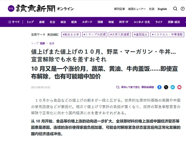 2021年9月,日媒《讀賣新聞》在一篇關注日本通貨膨脹和物價上漲的報道中提到,在進入0月之後,包括蔬菜、黃油還有牛肉蓋飯在內的物價可能會迎來一波大上漲。上漲的可能原因之一是中國經濟已經逐漸從新冠疫情的陰霾中走出,中國人旺盛的購買慾也隨之恢復,然後就是在全球市場到處買買買,把各種商品原材料的價格都給買貴了,最終害得日本人的生活成本又得跟着往上漲。