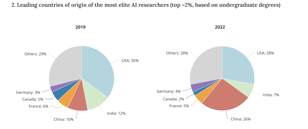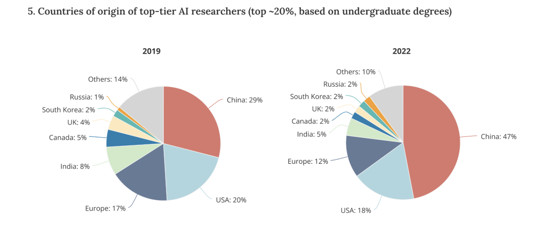 而如果我們不管在中國還是在美國工作,單純只算看你在哪裏讀的本科,那麼在全球的AI產業裏,近半數的高級AI研究人員本科都是在中國讀的——2019年他們佔29%,這已經很多了;但沒想到,2022年直接飆到47%,快接近一半了。