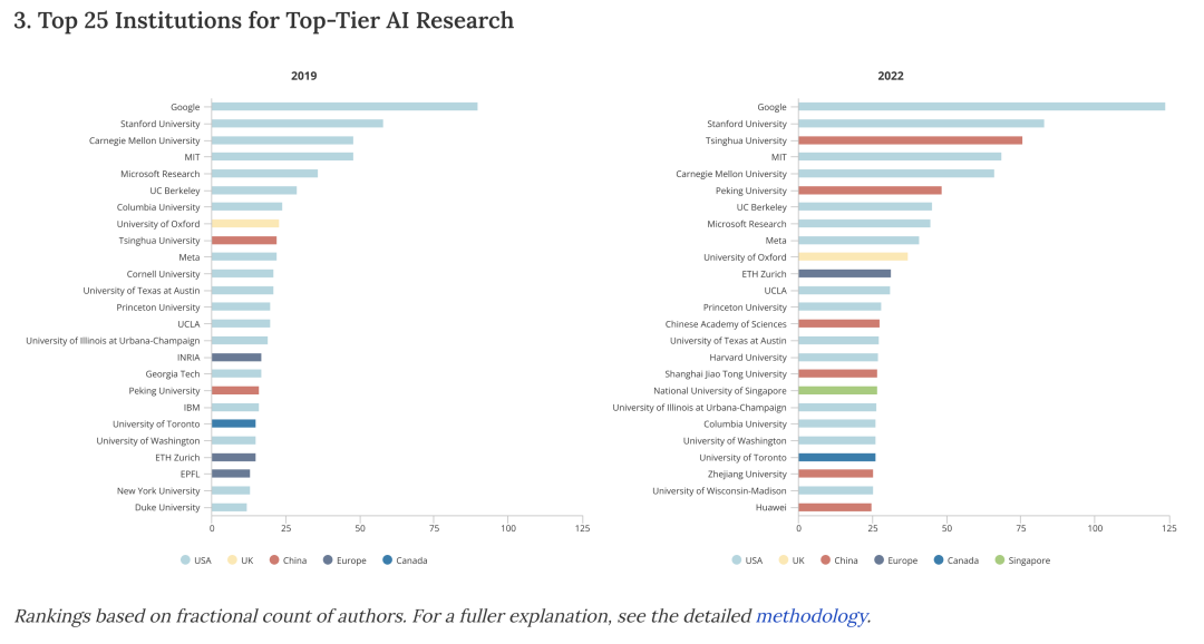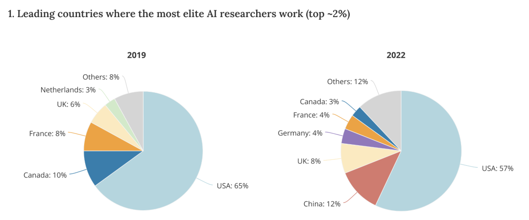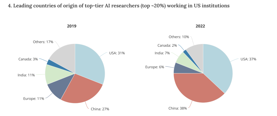 實際上,在2022年,哪怕在美國的頭部AI研究機構裏,華人的數量已經比美國人還多了——在美國排名前20%的AI機構中,華人研究員的比例從2019年的27%漲到2022年的38%,直接反超美國本土研究員(37%)。