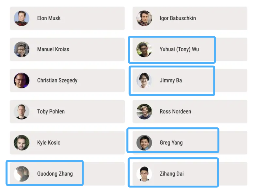 實際上,整個xAI公司的創始人團隊裏,華裔的色彩都非常濃厚。算上吳宇懷和Jimmy Ba這兩位,在包括馬斯克的12個創始人裏,華裔佔了5席,剩下的三位分別是:Greg Yang,楊格(音譯),湖南人,初中去美國讀書,本碩都在哈佛數學系。Guodong Zhang,張國棟(音譯),浙江大學信息工程專業本科,多倫多大學博士。Zihang Dai,戴子航(音譯),清華大學本科,卡耐基梅隆大學碩士博士。