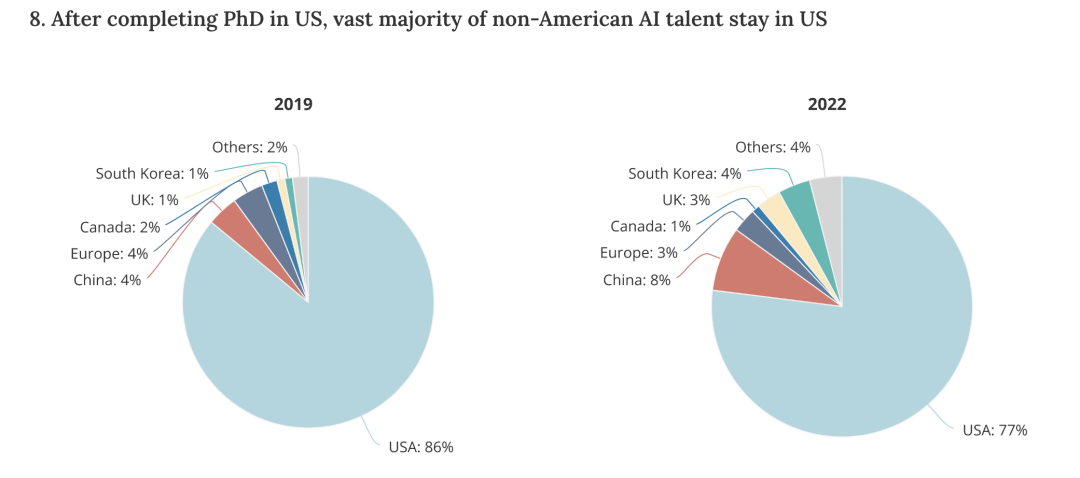 2019VS2022 在美國博士畢業後,大多數非美國籍AI人才仍然選擇留在美國****資料來源:保爾森基金會