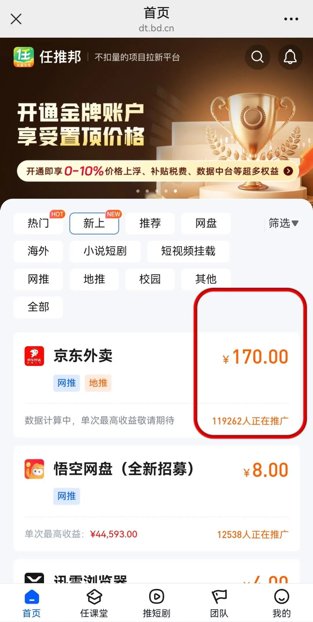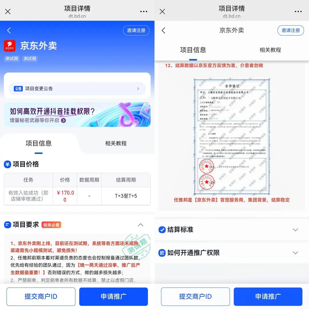小紅書、抖音和微信公眾號上,無數關於京東地推的消息幾乎在一夜之間火了起來,省團、街推聯盟、任推邦等線上地推平台紛紛上線相關項目,各路本地服務商也開始招兵買馬,單店170元的高額報酬,更是讓無數想要趕上風口的玩家競相入局——截至2月24日,僅在任推邦這個平台上,京東外賣的推廣人數就超過了11萬人。