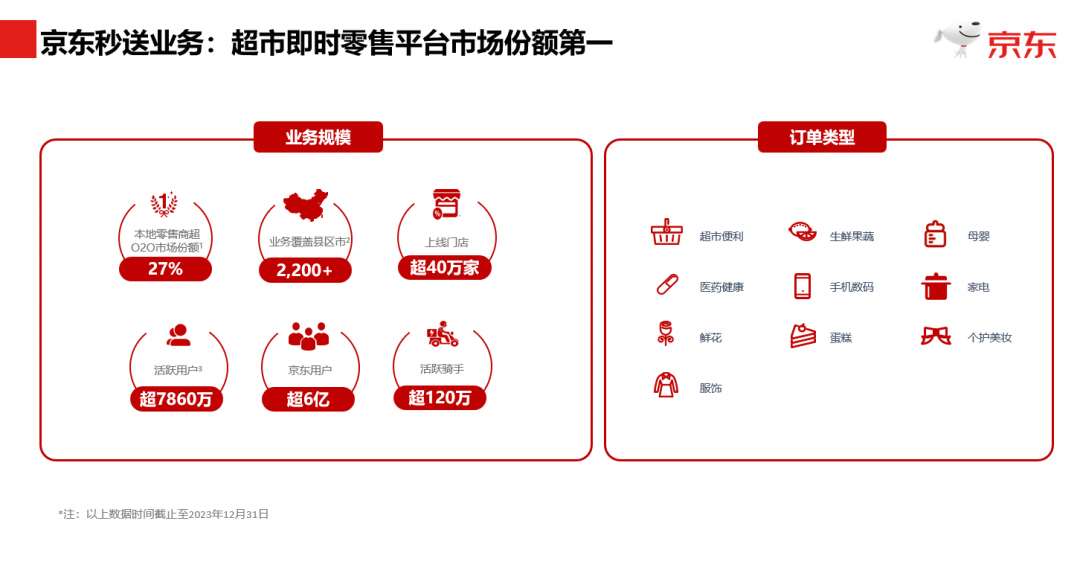 美團研究院數據顯示,2023年,美團有745萬“有接單收入騎手”,其中,全年接單在260天以上的佔總人數的11%,約為82萬人;京東外賣配送由達達秒送,一位地推人員給我們展示的PPT中,顯示截至2023年12月31日,京東秒送業務覆蓋了2200個縣區市,有着超120萬活躍騎手。