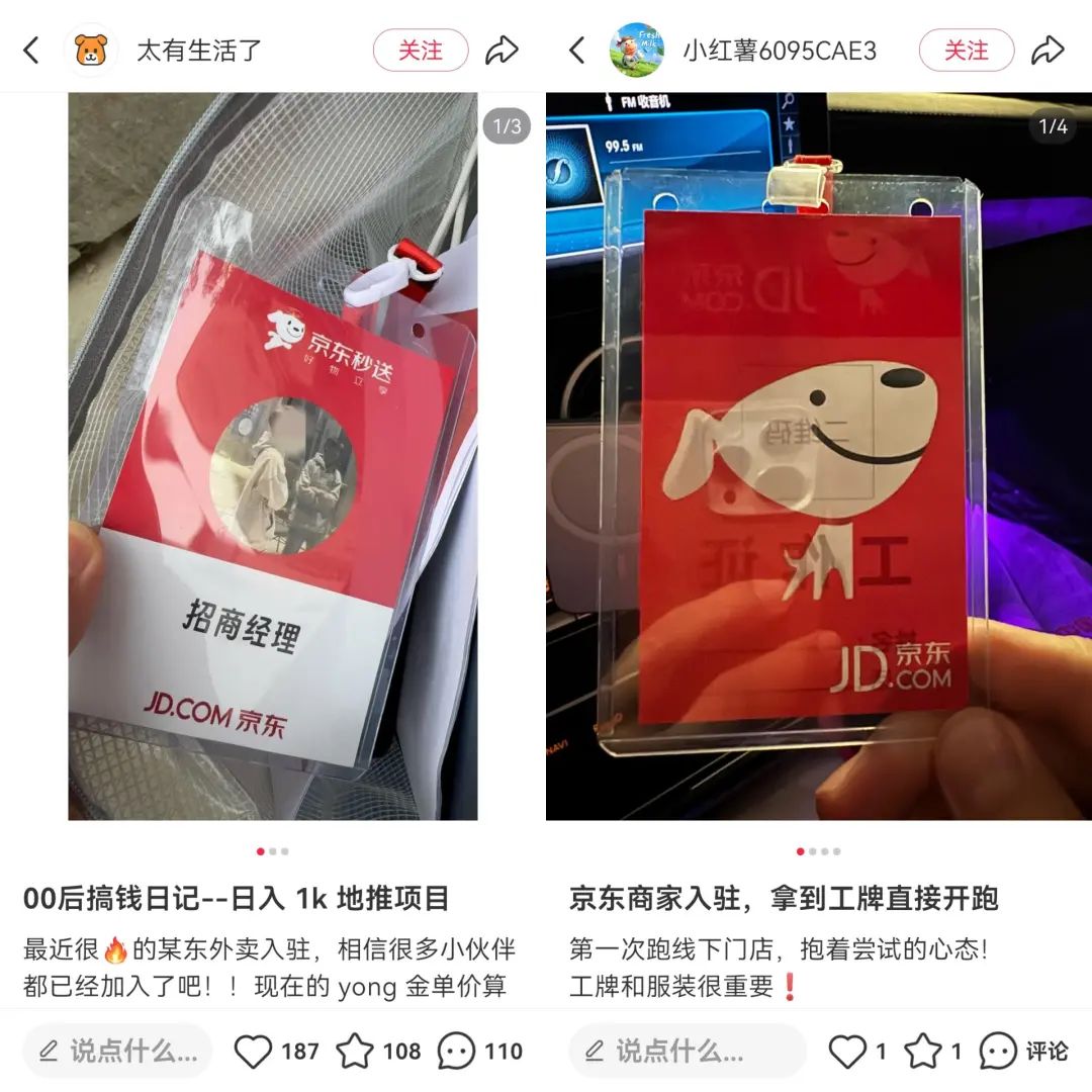 這批京東外賣的地推人員,和曾經阿里、美團的地推鐵軍不同,他們更多是“自由作戰”,通過線上平台註冊,拿着社交平台上總結出的話術,帶着自己打印的京東工牌,從京東外賣最早佈局的39城到全國各地的小縣城,開始了一場“搶風口”的比賽。