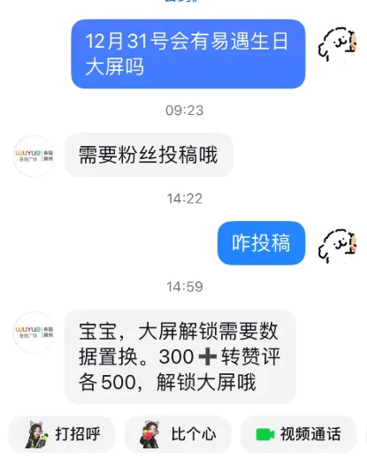 現在有不少商場,會有免費應援解鎖大屏的活動,往往是要求粉絲在某平台上的宣傳點贊達到一定數量,部分還會附帶對商場粉絲增長的需求,當達到要求後,商場就會免費進行一天的角色大屏應援。