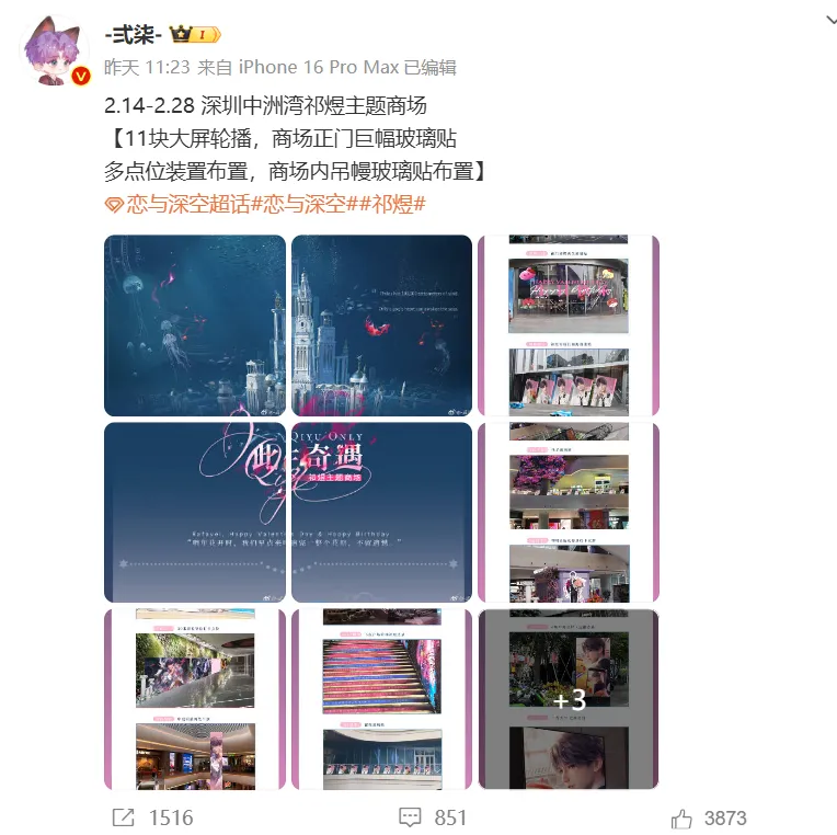 在最近的情人節檔期裏,出現了《戀與深空》角色“祁煜”的花費60萬人民幣打造的天價應援主題商場。