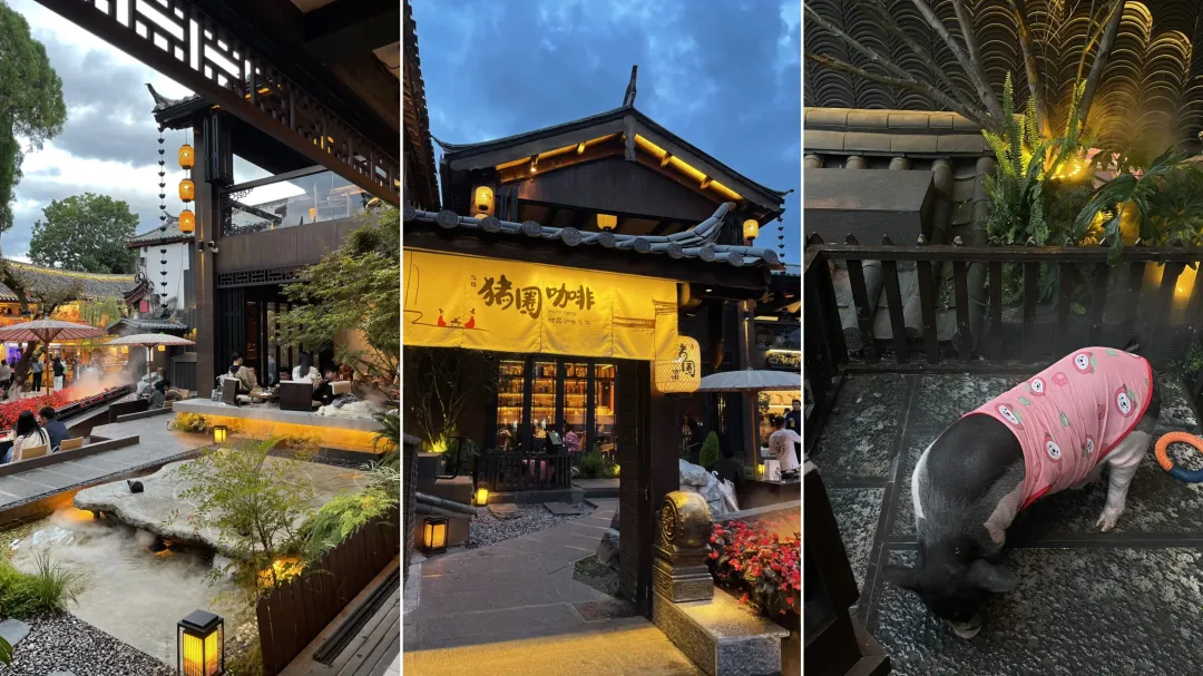 麗江豬圈咖啡設計成一座古色古香的中式建築,專門劃出小香豬活動區域,網友調侃“連豬都變得古色古香”。