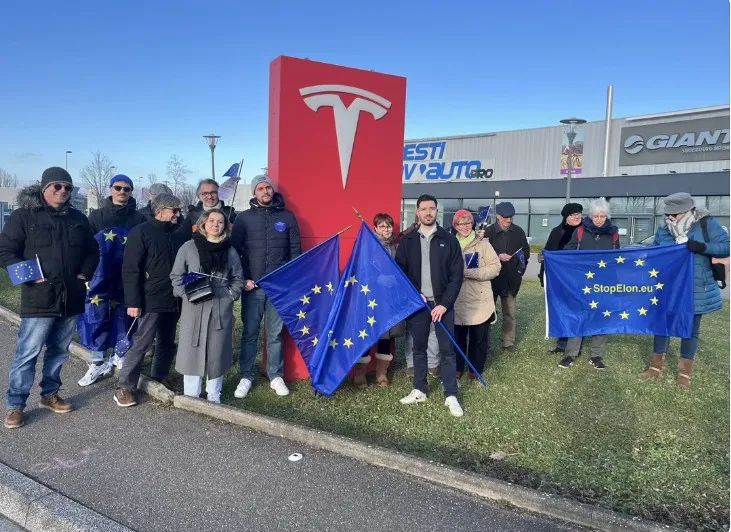 抗議民眾聚集在斯特拉斯堡的特斯拉展廳前