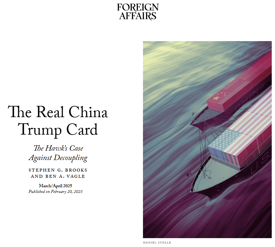 1. 2025年3-4月期的《外交事務》,發了Stephen G. Brooks 和 Ben A. Vagle的文章《The Real China Trump Card:The Hawk’s Case Against Decoupling》。兩人分別的達特茅斯學院的政府學教授與美國財政部的政策分析師。這文章的立論基礎,又回到了美國之前對中國的認知,認為中國經濟規模被誇大,只有美國的一半。