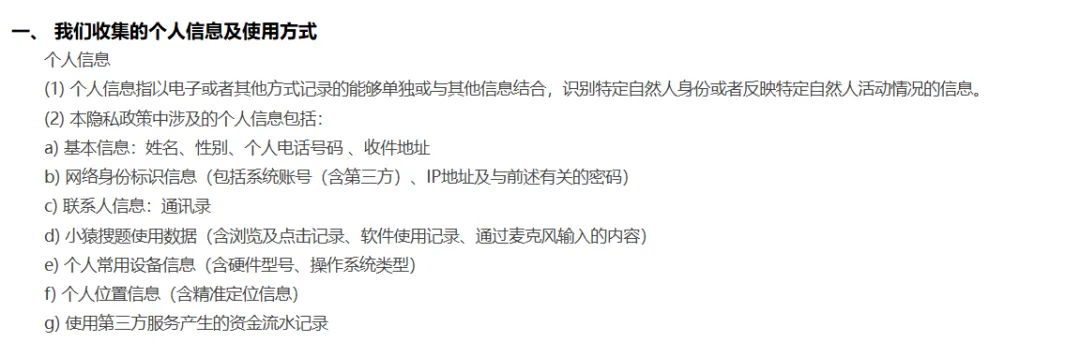 與此同時,小猿搜題在用户協議中表示需要收集8項用户個人信息,其中甚至包括使用第三方服務產生的資金流水記錄。