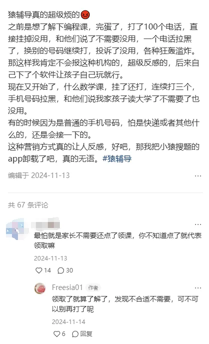 還有學生家長髮布筆記稱,“猿輔導真的超級煩的,之前是想了解下編程課,完蛋了,打了100個電話,直接掛掉沒用,和他們説了不需要沒用,一個電話拉黑了,換別的號碼繼續打,投訴了沒用,各種狂轟濫炸。那這樣我肯定不會報這種機構的,超級反感的,後來自己下了個軟件讓孩子自己玩就行。現在又開始了,什麼數學課,掛了還打,連續打三個,手機號碼拉黑,和他們説我家孩子讀大學了不需要了也沒用。有的時候因為是普通的手機號碼,怕是快遞或者其他什麼的,還是會接一下的。這種營銷方式真的讓人反感,好吧,那我把小猿搜題的app卸載了吧。”