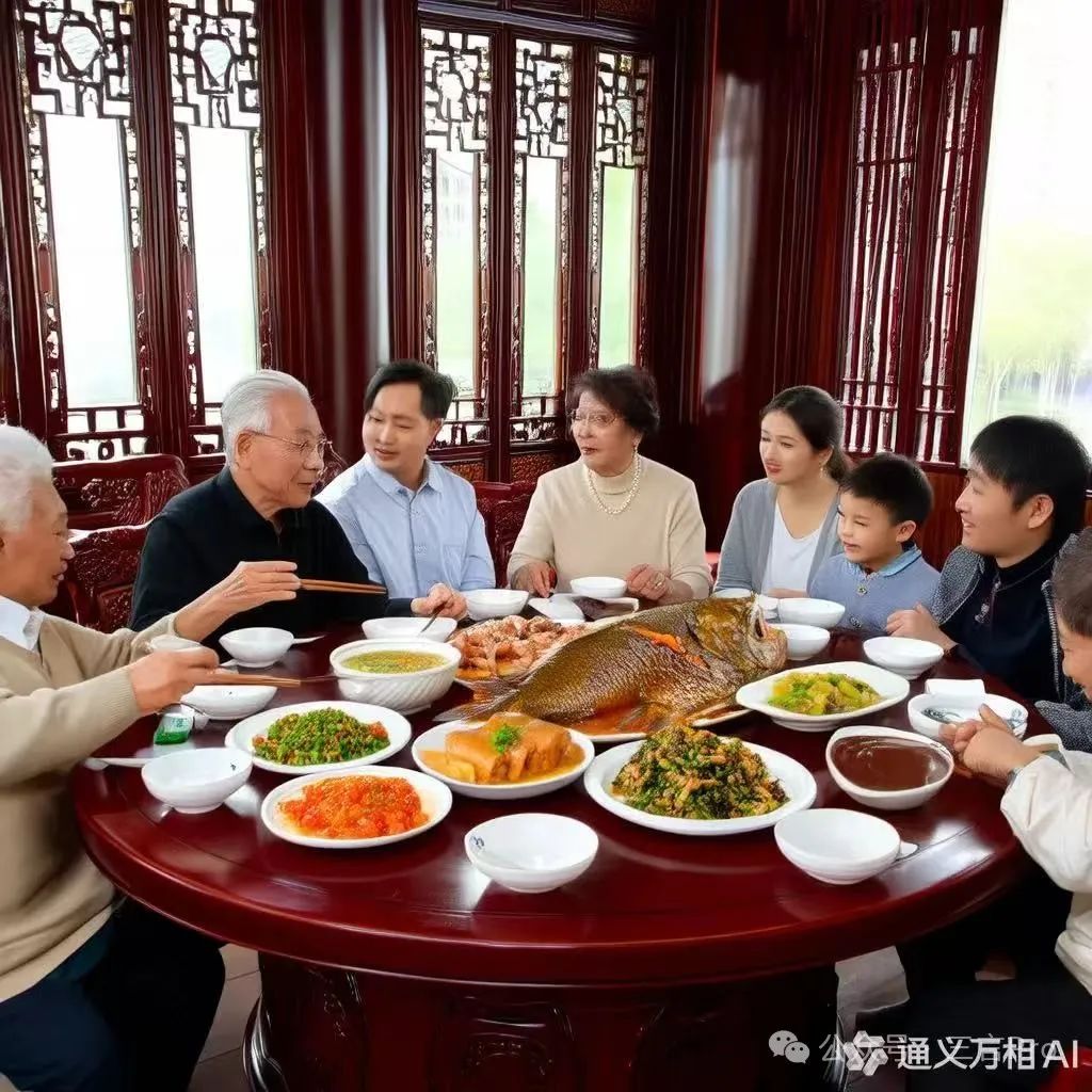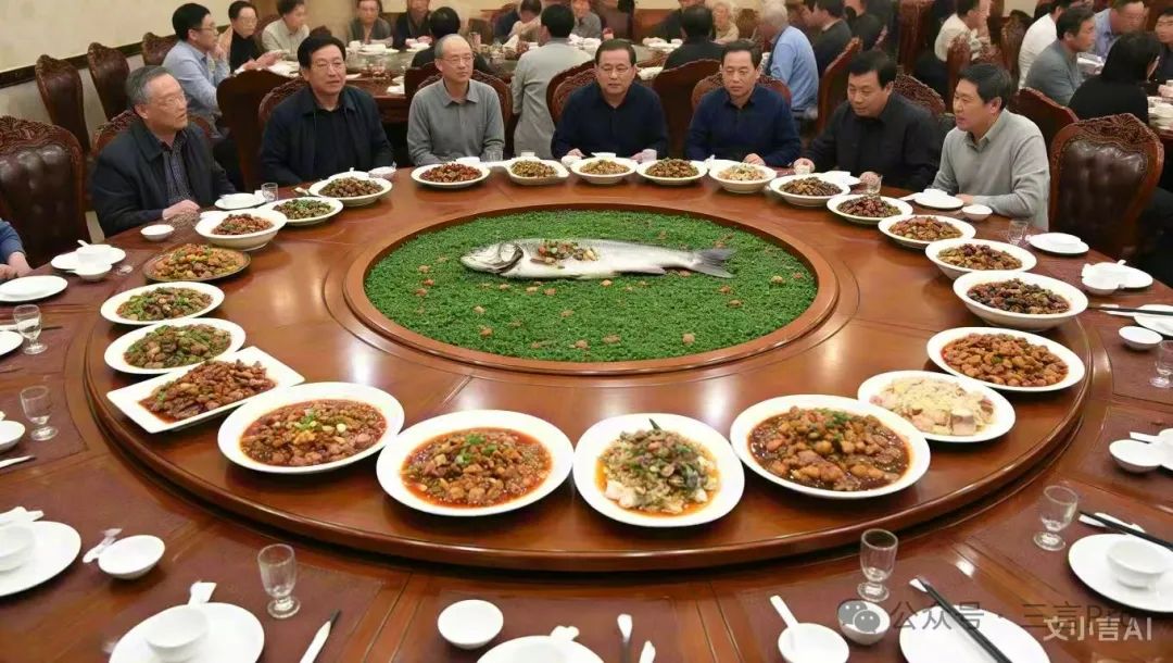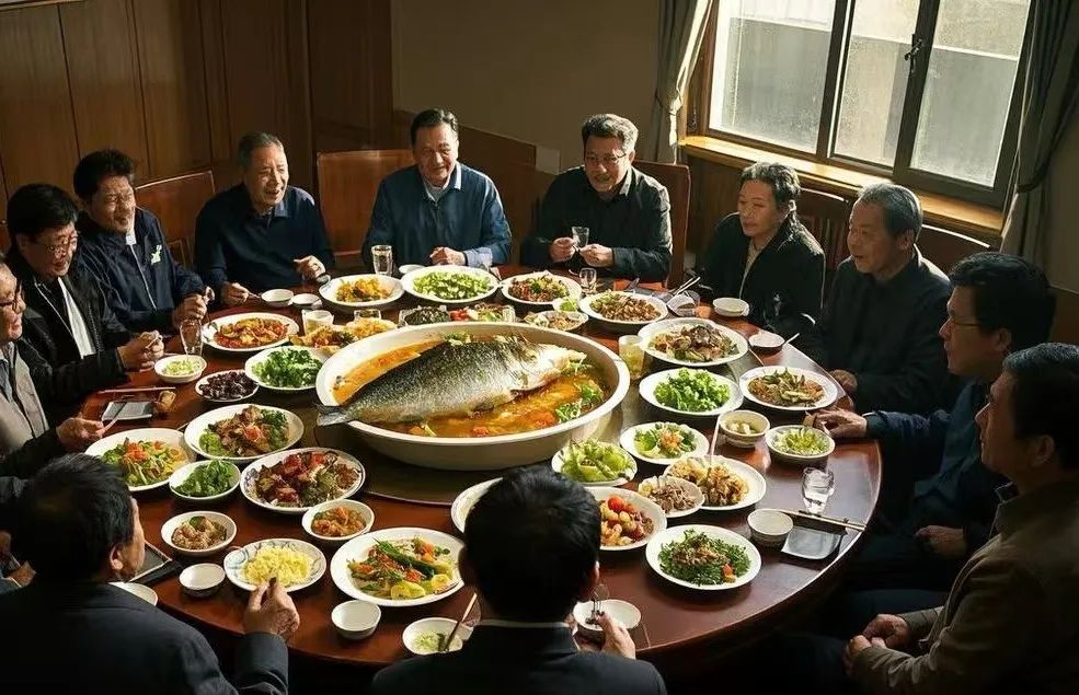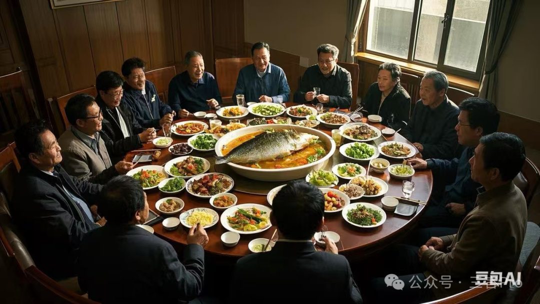 描述詞為“幫我生成一張圖片:一個飯店的大包間裏,大圓桌坐了20個人,桌子上很多菜,中間是比較大的魚。比例16:9。”