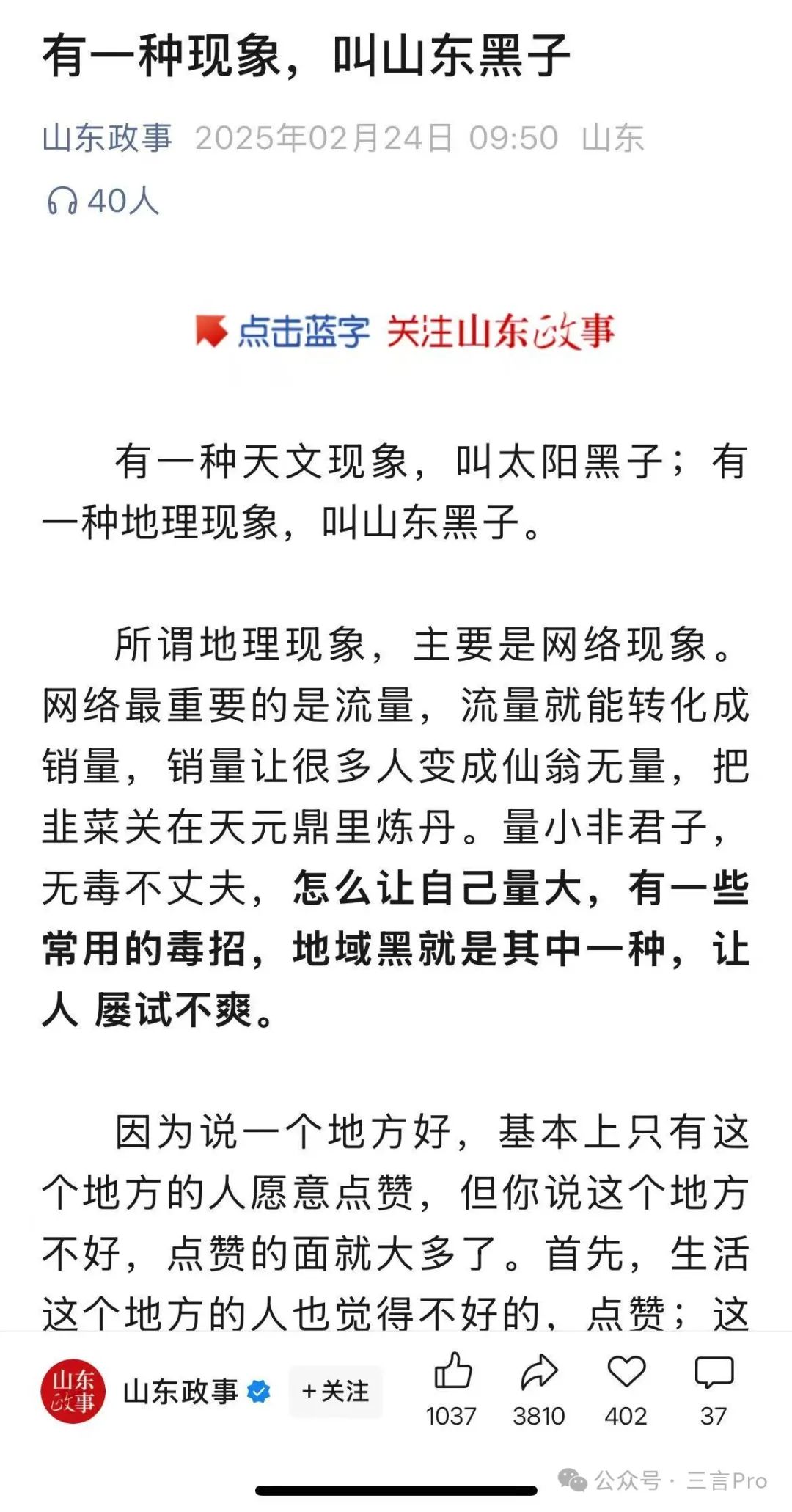 三言科技消息,今日大眾報業集團旗下賬號“山東政事”轉發了作家魏新反駁“山東黑子”的文章,雖然是轉發,但也表達了態度。