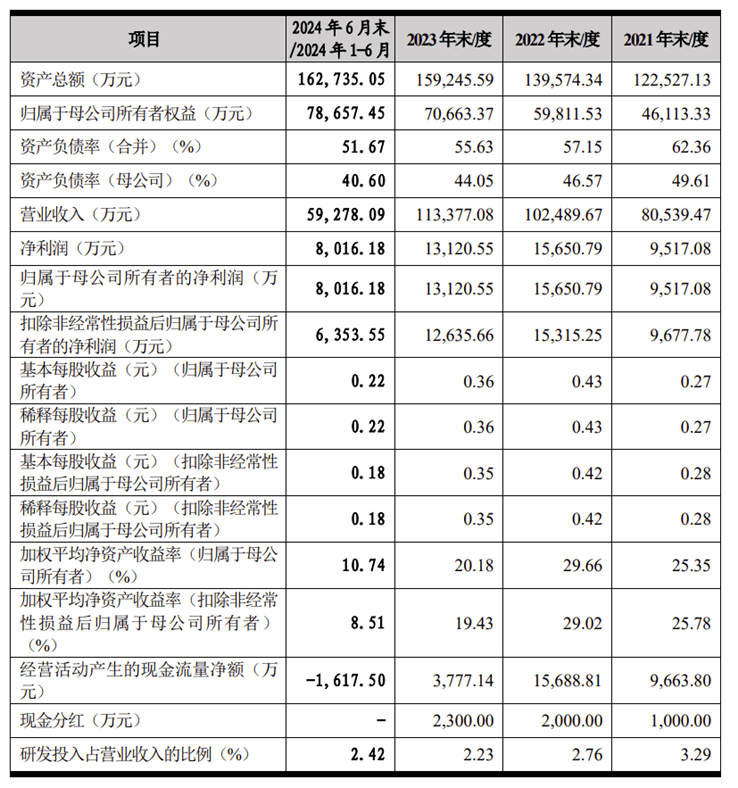 招股書顯示,2021-2023年及2024年上半年(下稱“報告期內”),濟人藥業營業收入分別為80539.47萬元、102489.67萬元、113377.08萬元及59278.09萬元,歸屬於母公司股東的淨利潤分別為9517.08萬元、15650.79萬元、13120.55萬元及8016.18萬元。