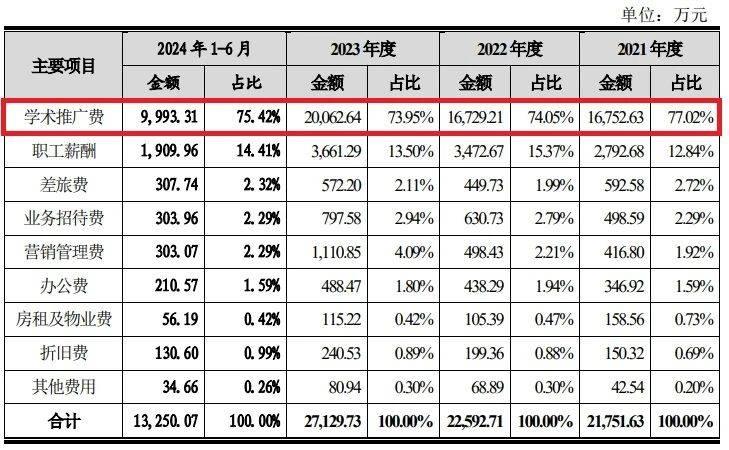 最重要的一點是,報告期內,濟人藥業銷售費用分別為21751.63萬元、22592.71萬元、27129.73萬元和13250.07萬元,佔營業收入比例分別為27.01%、22.04%、23.93%和22.35%。銷售費用主要由學術推廣費和職工薪酬構成,兩者合計佔比接近90%。
