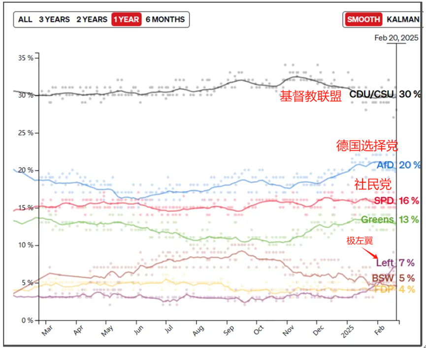 我在22日的短評裏已經分析過,在大選前,德國的民調顯示,中右翼的基督教聯盟黨是以30%支持率位居第一,極右翼的德國選擇黨是以20%的支持率位居第二,之前的執政黨社民黨是以16%的支持率位居第三,主導德國去工業化進程的綠黨仍然有13%的支持率,位居第四。