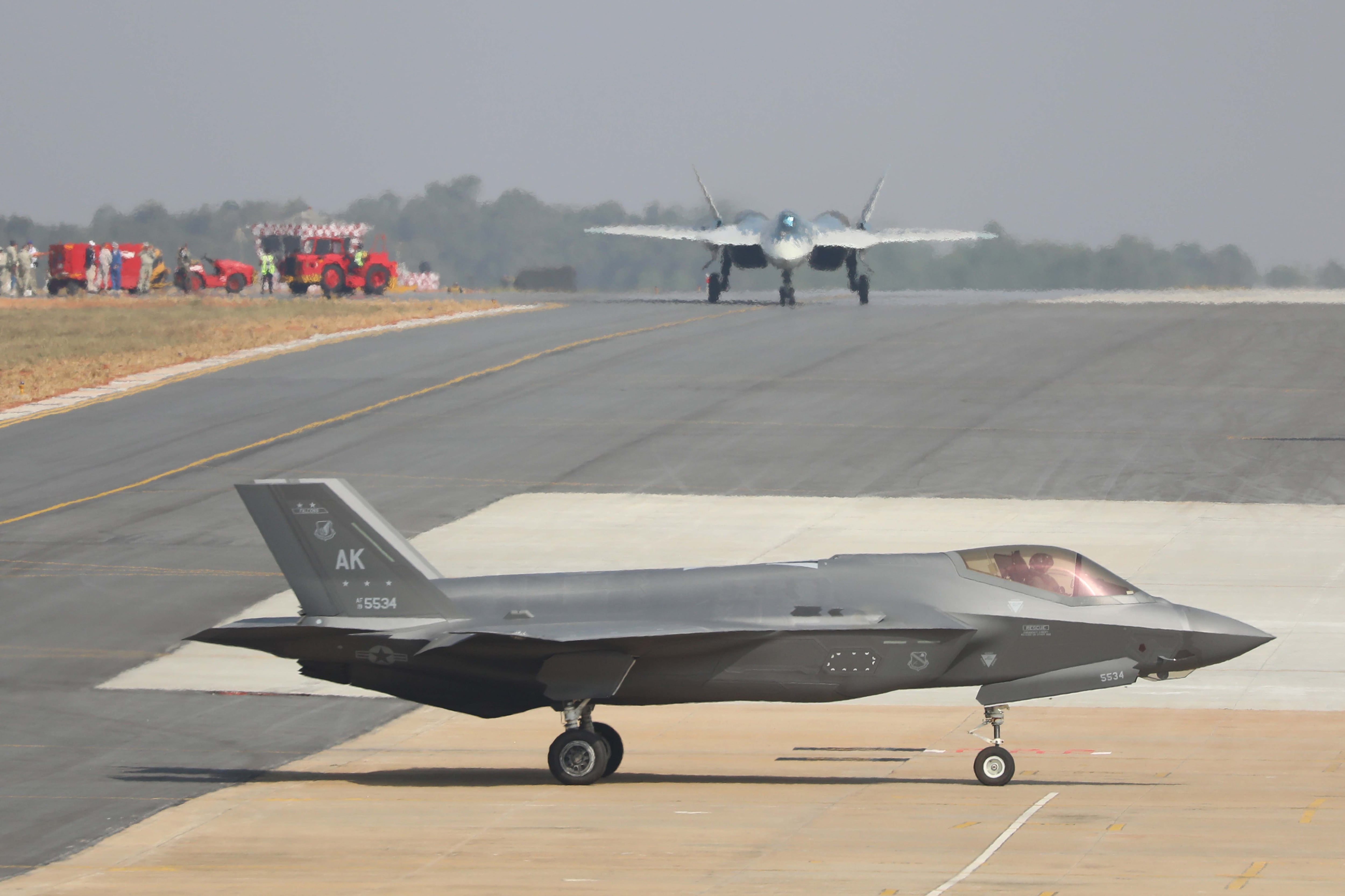 2025年2月,在印度班加羅爾舉行的印度航空展上,一架美國F-35A(前景)與俄羅斯Su-57E共享一條跑道。(戈登·亞瑟/工作人員)