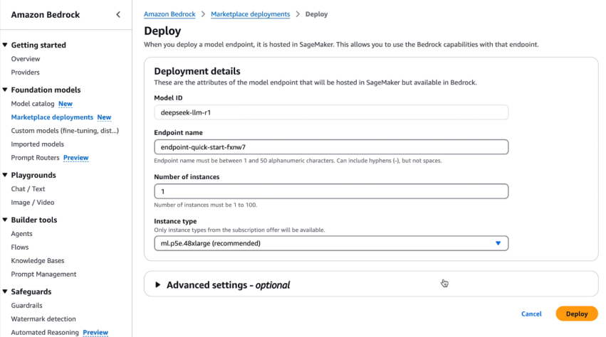 比如在Amazon Bedrock Marketplace部署DeepSeek-R1模型,亞馬遜雲科技給出的可選實例包括 EC2 P5e 的 48xlarge 型號,單個實例包含8顆H200 GPU,以及3200Gbps的網絡帶寬,可以説配置豪華,能最大程度發揮模型的性能。
