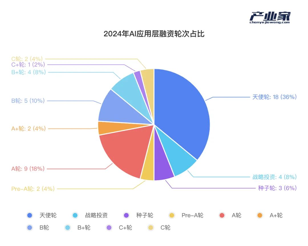 然而,不同於基礎層,投資者對上層應用層則更為樂觀。據統計,2024年AI應用層的融資事件當中,新成立企業佔比近50%,36%融資事件集中於天使輪。資本“搶灘”早期項目跡象明顯。