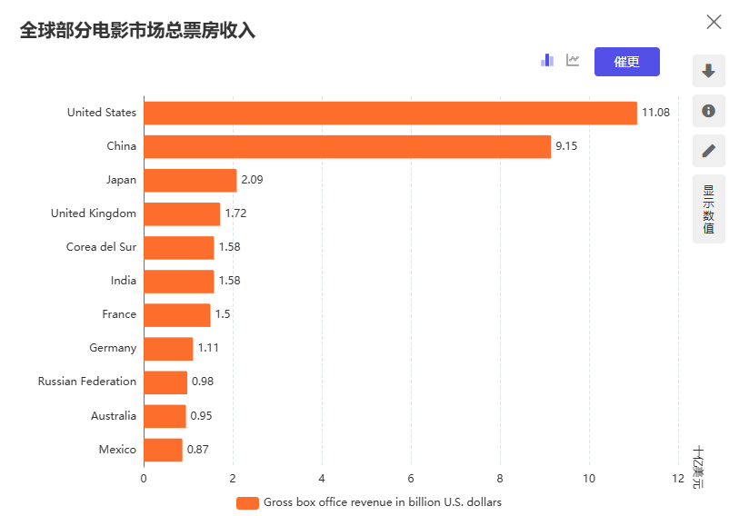 從歐洲市場來看,目前完全不能指望,只有希臘和塞浦路斯上映。歐洲排片比美國還要拉胯的原因是我先埋一個坑再説。如果把歐盟拆開,按照單一市場來看,去掉美中兩強之後,3-11名分別是日本、英國、韓國、印度、法國、德國、俄國、澳大利亞和墨西哥。從體量來説,中美任何一個單一市場都可以和3-11名相加差不多。
