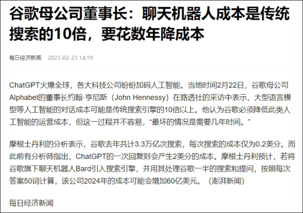 谷歌一年的搜索量是幾萬億次,每次搜索的成本是2美分,如果切換為AI問答模式,一年最少要額外付出幾百億美元的成本,每年利潤的三分之一都要被燒掉,就算是谷歌也扛不住,小公司和創業者就更扛不住。