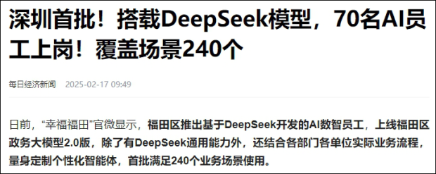 這種迫近感,很大程度上是一批國民級應用,以及政企和居民服務部門迅速接入DeepSeek帶來的。當你在2025年1月底,第一次在新聞上看到人們討論DeepSeek R1的發佈的時候,應該很難想象到,僅僅20天之後,基於DeepSeek開發的70個AI數智員工,就在深圳福田區的政務系統上崗,5分鐘幹掉了人類5天的工作量。