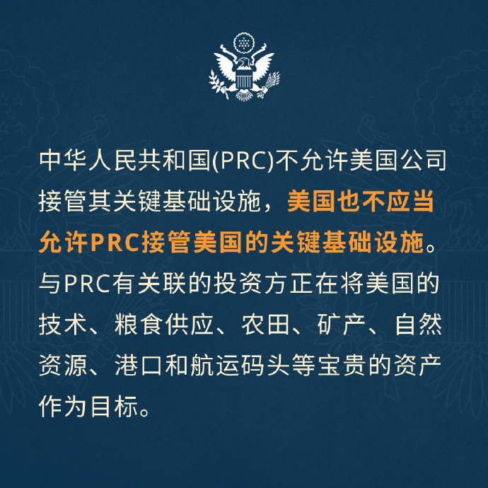 經濟安全就是國家安全。PRC不允許美國公司接管其關鍵基礎設施,美國也不應當允許PRC接管美國的關鍵基礎設施。與PRC有關聯的投資方正在將美國的技術、糧食供應、農田、礦產、自然資源、港口和航運碼頭等寶貴的資產作為目標。