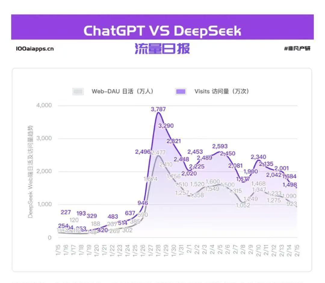 按照第三方機構非凡產研的數據,2025年2月15日,DeepSeek App端日活用户為3761萬,相較半個月前的峯值下滑了10%左右。