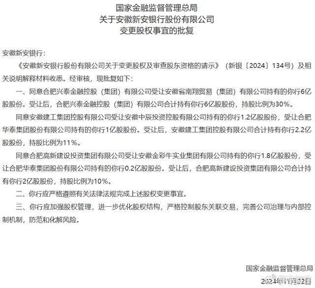 2024年11月28日,國家金融監督管理總局發文批覆,同意合肥興泰金融控股(集團)有限公司、安徽建工集團控股有限公司、合肥高新建設投資集團有限公司受讓新安銀行合計10.2億股股份,三家安徽國資企業持股比例合計達到51%。此次受讓後,新安銀行第一大股東易主,地方國資將控股該行。