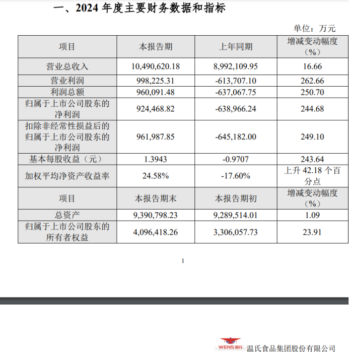 據其2月20日發佈的2024年業績快報顯示,去年温氏股份實現營業總收入為 1049.06 億元,歸屬於上市公司股東的淨利潤為 92.45 億元,歸母淨利潤同比上升 244.68%。營收、利潤同比大幅增長的最主要原因還是在於豬賣得多了,豬肉漲價了。