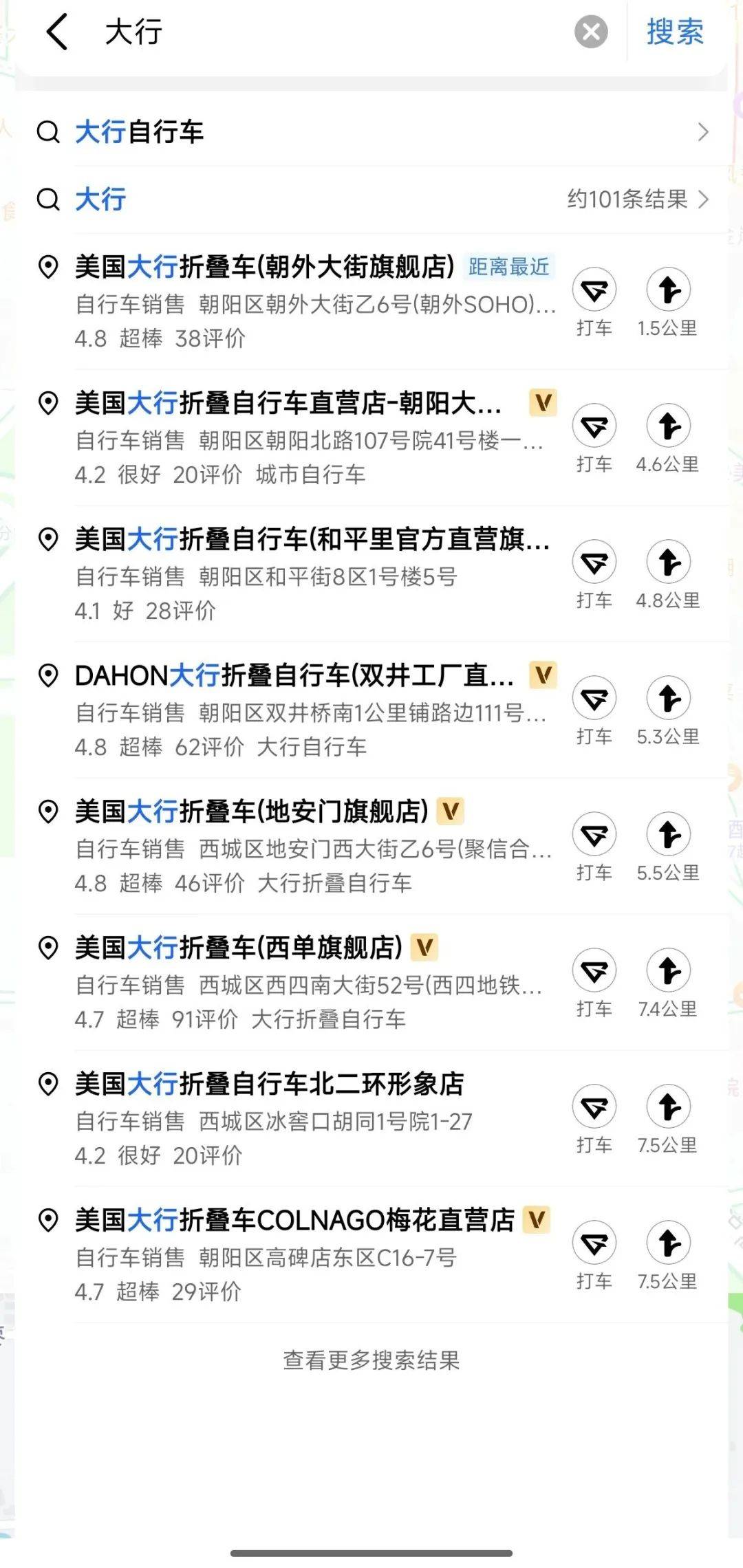 「探客出行」搜索發現,大行品牌的線下店鋪名稱在出行軟件上均顯示為“美國大行摺疊自行車”字樣,充分外顯其“美國”屬性。