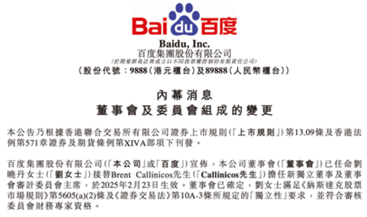 2月24日週一早間,百度集團在港交所發佈了《董事會及委員會組成的變更公告》。百度集團宣佈,公司董事會已任命劉曉丹女士接替Brent Callinicos先生,擔任新的獨立董事及董事會審計委員會主席,該任命自2025年2月23日起生效。董事會已確認,劉曉丹滿足《納斯達克股票市場規則》及《證券交易法》相關條例規定的“獨立性”要求,並符合審核委員會財務專家資格。從披露來看,目前百度集團的董事會包括董事李彥宏,以及獨立董事—聯想楊元慶、金沙江創投丁健、紀源資本符績勳、京東許冉,以及劉曉丹。
