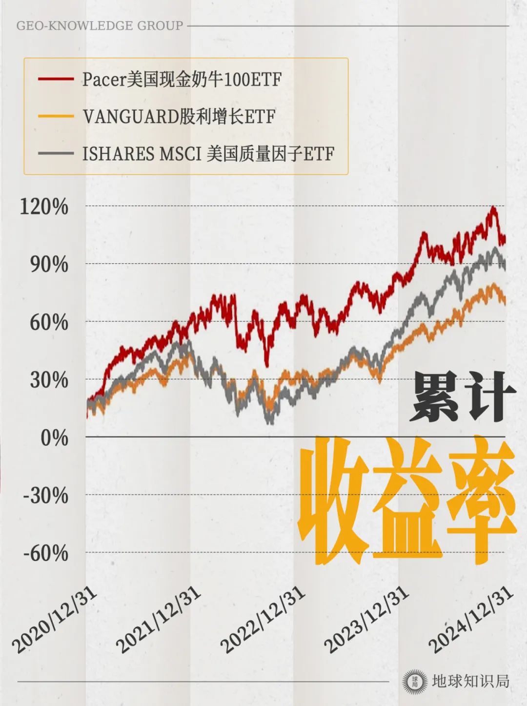 像2016年上市的COWZ(Pacer US Cash Flows 100 ETF,又稱現金奶牛ETF),近五年甚至跑贏了iSHARES MSCI美國質量因子ETF。
