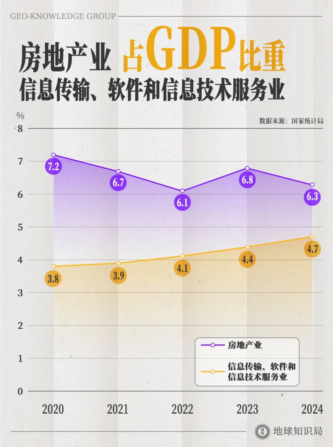 其結果就是經濟結構的優化,過去五年中,房地產業佔GDP比重從2020年的7.2%下降到2024年的6.3%;信息傳輸、軟件和信息技術服務業則以年均13.7%的增速擴張,佔GDP比重從2020年的3.8%增長到2024年的4.7%。