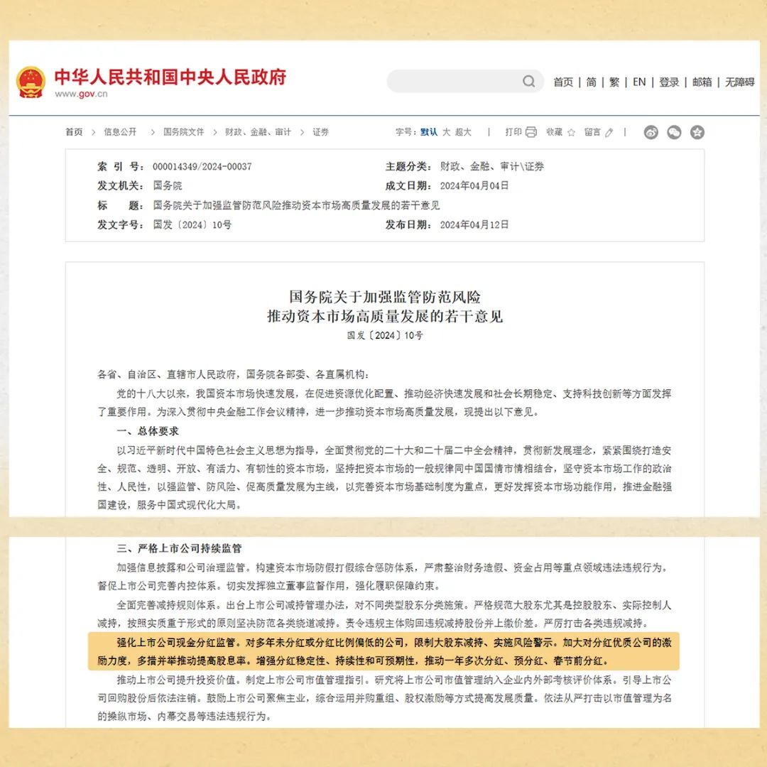 “強化上市公司現金分紅監管。對多年未分紅或分紅比例偏低的公司,限制大股東減持、實施風險警示。加大對分紅優質公司的激勵力度,多措並舉推動提高股息率。增強分紅穩定性、持續性和可預期性,推動一年多次分紅、預分紅、春節前分紅。”