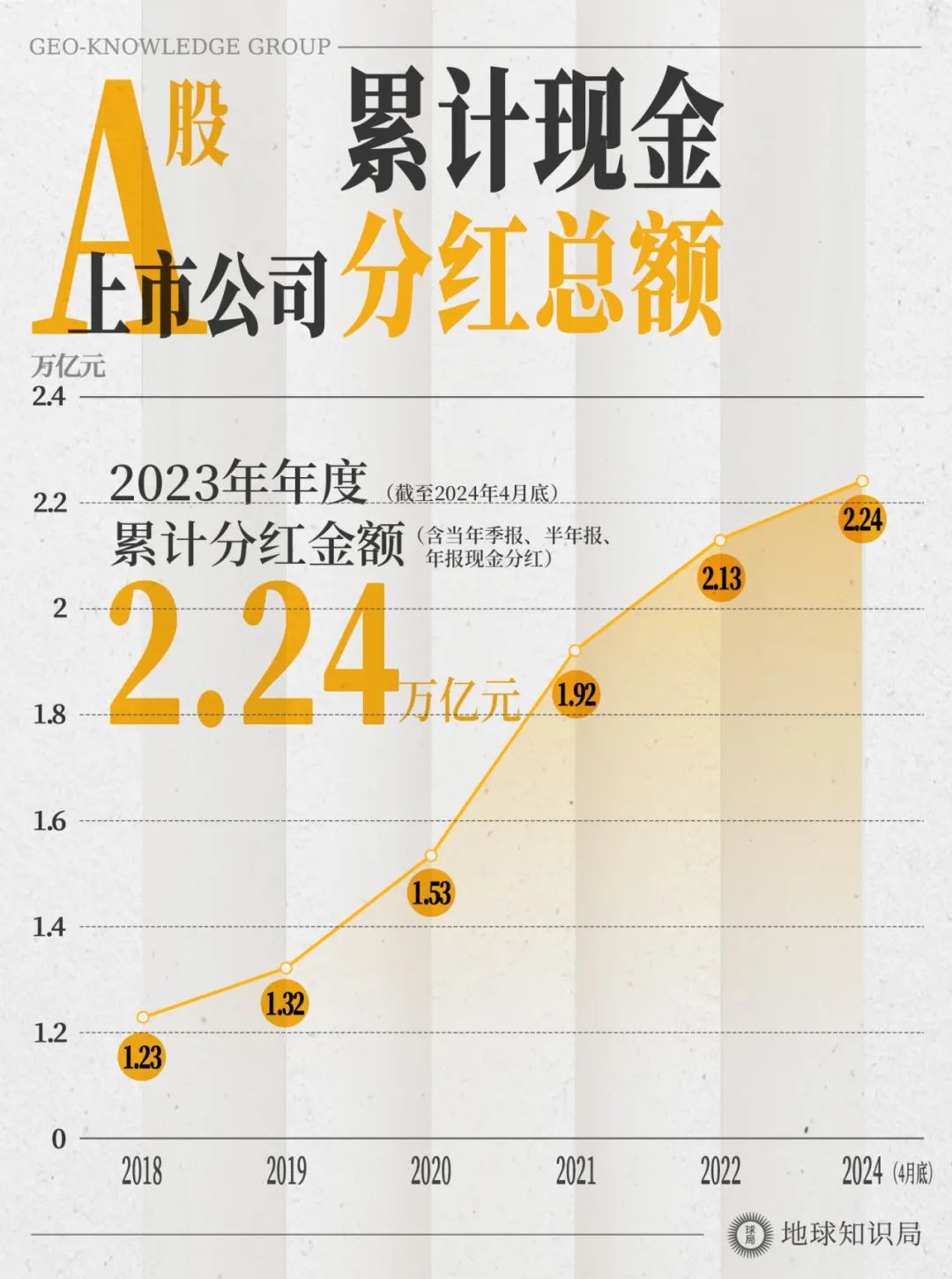 上市公司的分紅力度逐年加大,也在響應政策,截至2024年4月底,2023年年度(含當年季報、半年報、年報現金分紅)累計分紅金額達2.24萬億元。