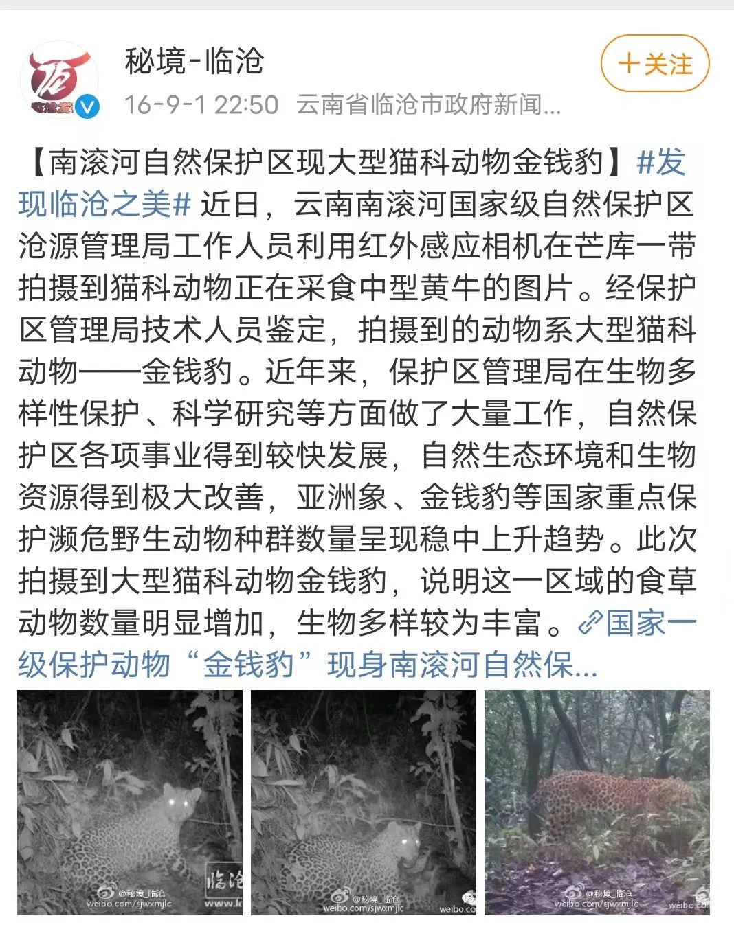 2016年9月1日,微博號“秘境-臨滄”發佈信息:雲南南滾河國家級自然保護區滄源管理局工作人員利用紅外感應相機在芒庫一帶拍攝到貓科動物正在採食中型黃牛的圖片。經保護區管理局技術人員鑑定,拍攝到的動物系大型貓科動物——金錢豹。