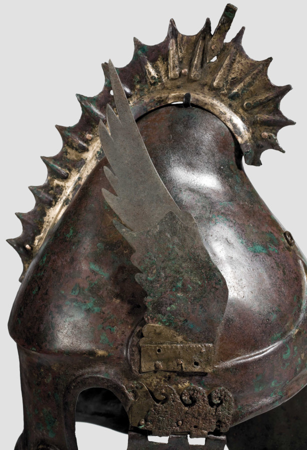 這些奇特的元素包括活動的“偽角”、中央的“鷹嘴”裝飾和由青銅箔做成的“翅膀”。這頂頭盔屬於所謂的“帶翼脊狀頭盔”風格。對於軍用裝備來説,這些裝飾看起來相當奇怪。這些元素到底是裝飾品還是具有某種功能呢?在那個時代,任何金屬都是珍貴的,而這些金屬卻被用在了不明所以的裝飾和裝置上。