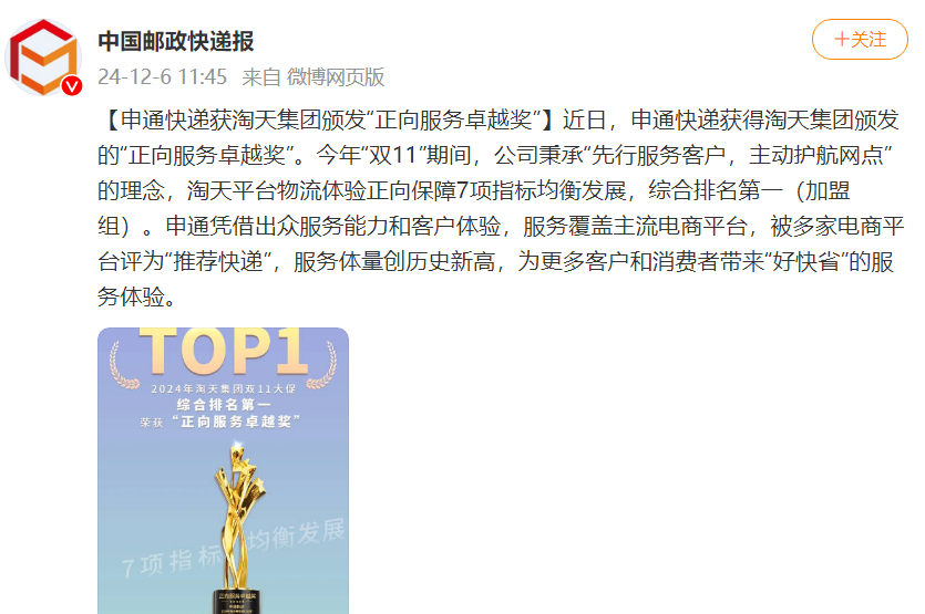 隨之而來的轉變和提升,可以説肉眼可見。2024年“雙11”,申通獲得了淘天平台頒發的“正向服務卓越獎”,服務質量指數名列加盟制快遞中的第一名。