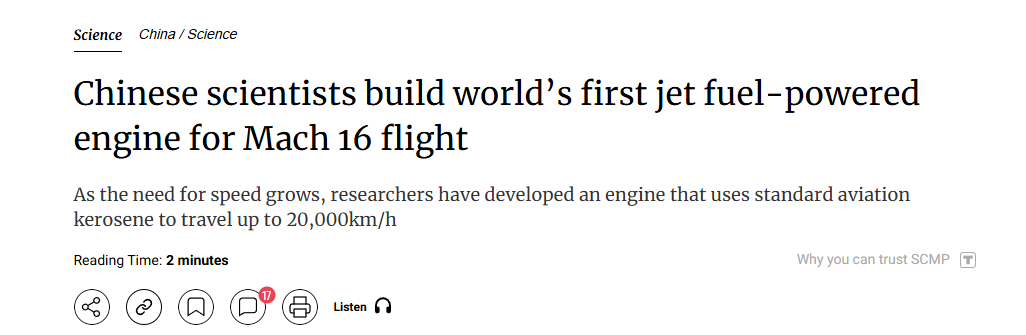 不過必須要説的是,某些人喜歡將中國發展高超音速技術,強行與軍事用途聯繫在一起,這就是妥妥的有色眼鏡。中國高科技發展的目標,從來都是造福全人類。正如《南華早報》所言,中國這項科研項目是中國雄心勃勃計劃的一部分,該計劃旨在到2030年建造一架能夠在一小時內抵達全球任何地方的飛機。這項技術的速度為16馬赫,可以在半小時內從上海飛往洛杉磯,將使可重複使用的太空飛機實現大氣層和軌道飛行的銜接。