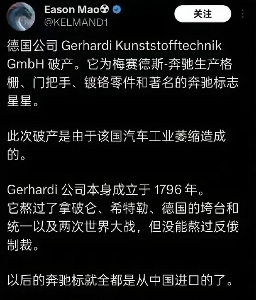 考驗也從來沒有停止。2022年底,隨着全球疫情的放開,又是一輪輪鼓吹西方生產恢復和中國產業將要轉移到東南亞,中國外貿額將迎來向下拐點的輿論戰。然而世界終究是物質的,物質的此消彼漲不會被媒體宣傳機器的鼓吹而扭轉。隨着中外交流全面恢復,西方人驚恐地發現中國的新能源產業在三年間已然進化成怪物。同一時期內,美國黨爭加劇通脹高企債務飆升,歐洲被攪進了俄烏戰場的血肉磨盤,領頭羊德國的工業4.0計劃變成了0.4,即將邁進歷史性的衰退而不自知,直到最近才驚呼自己即將被端上餐桌變成食物。