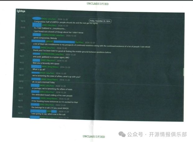在另外一個聊天內容中,在NSA的一個秘密聊天室中,NSA、DNI和SpaceCom官員聲稱圖爾西·加巴德(Tulsi Gabbard)是“狂熱的反同性戀者”、“俄羅斯特工”和MAGA“邪教”的成員。這些員工(包括至少一個“他們”)試圖從內部破壞加巴德。